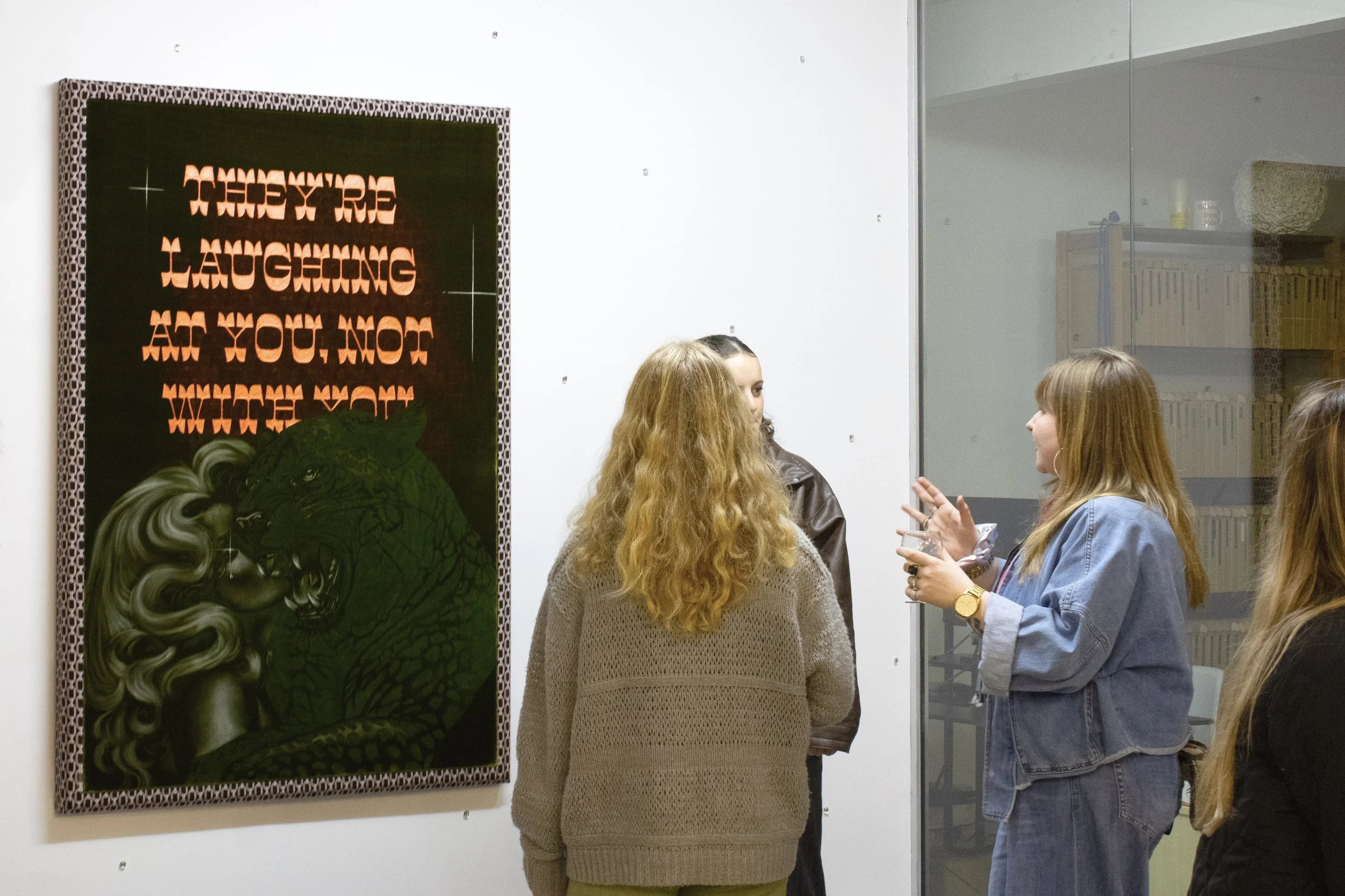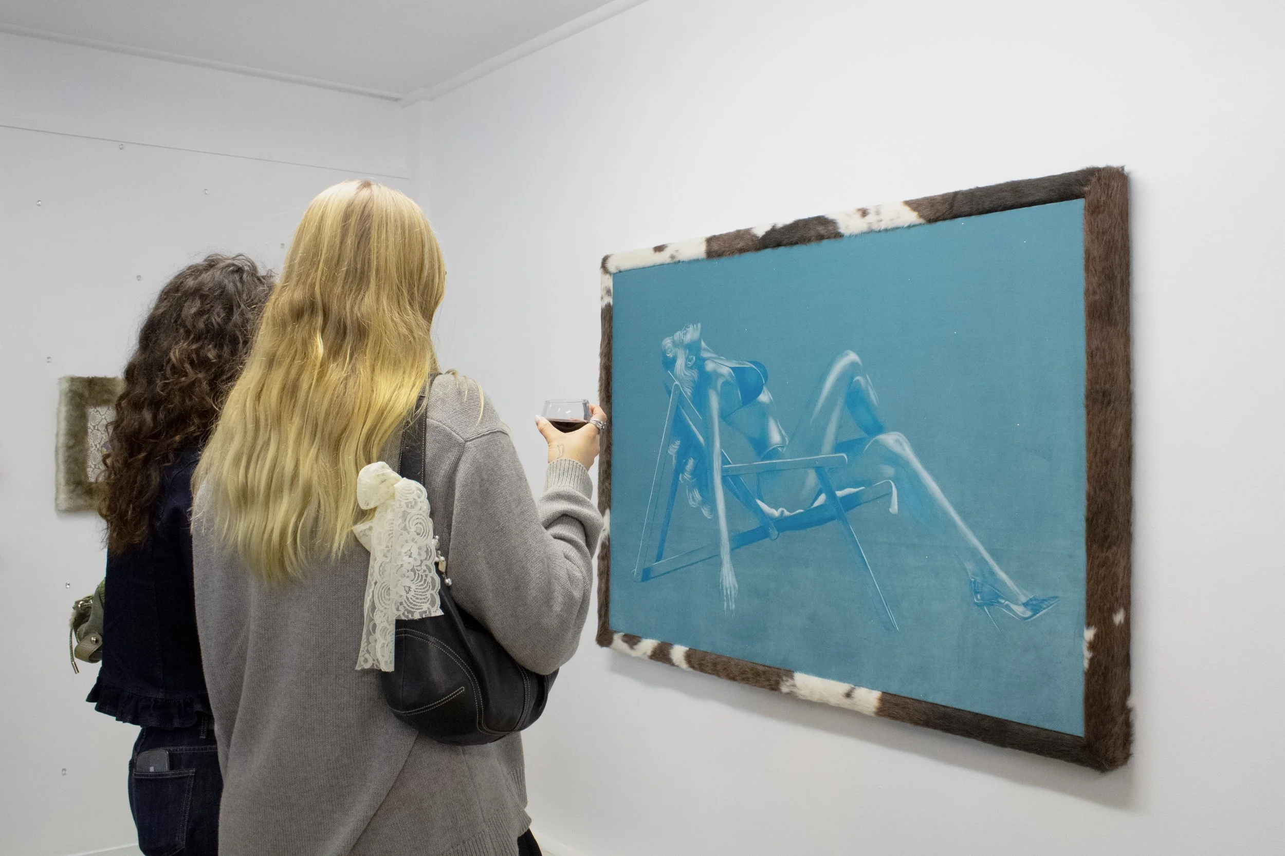 Painted on velvet and framed with faux fur, rhinestones, and patterned surfaces, the works lean into glamour and excess without trying to stabilise the image. The scenes feel familiar but don’t fully land. Things are pushed a bit too far, or not explained enough.