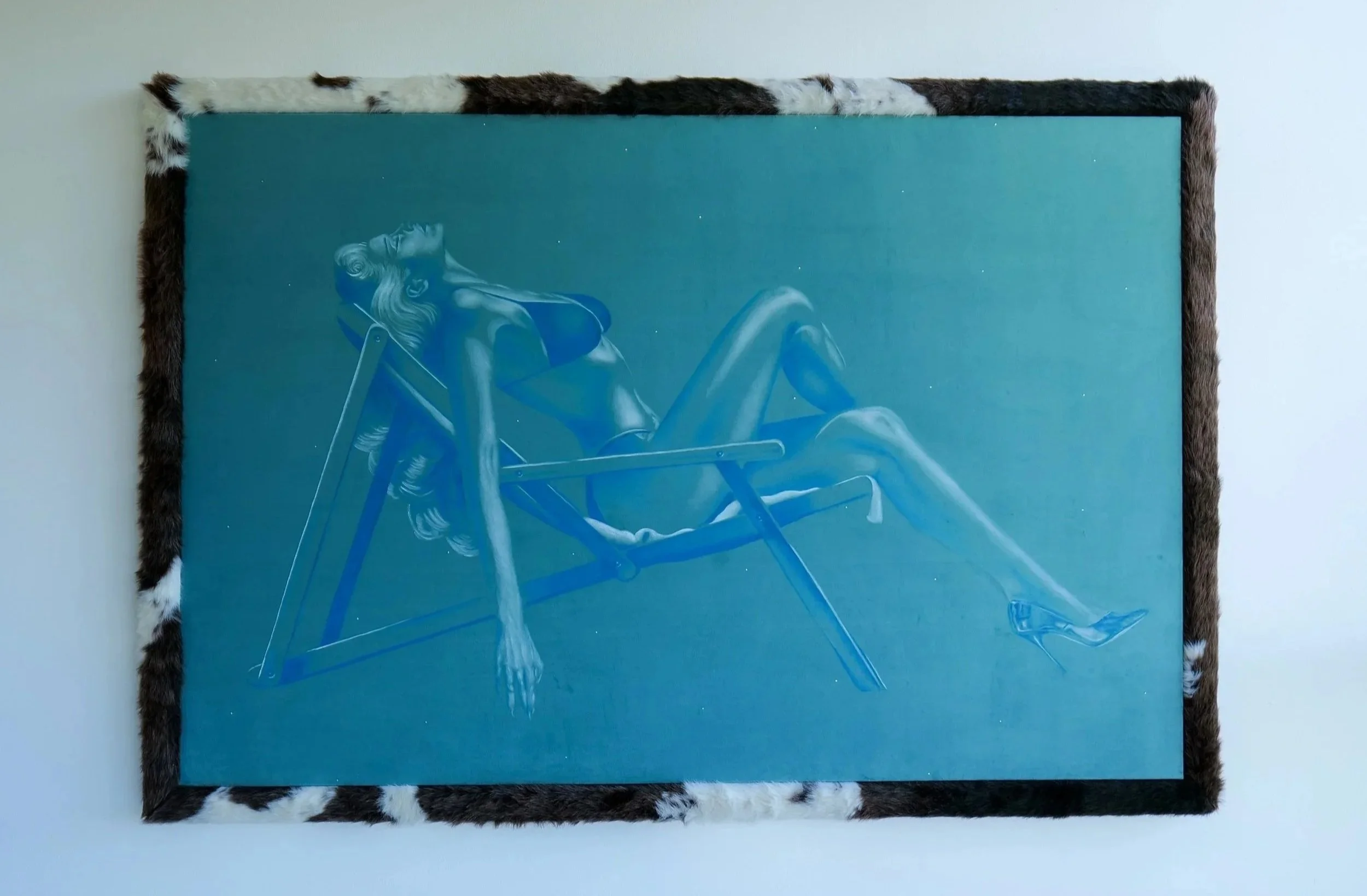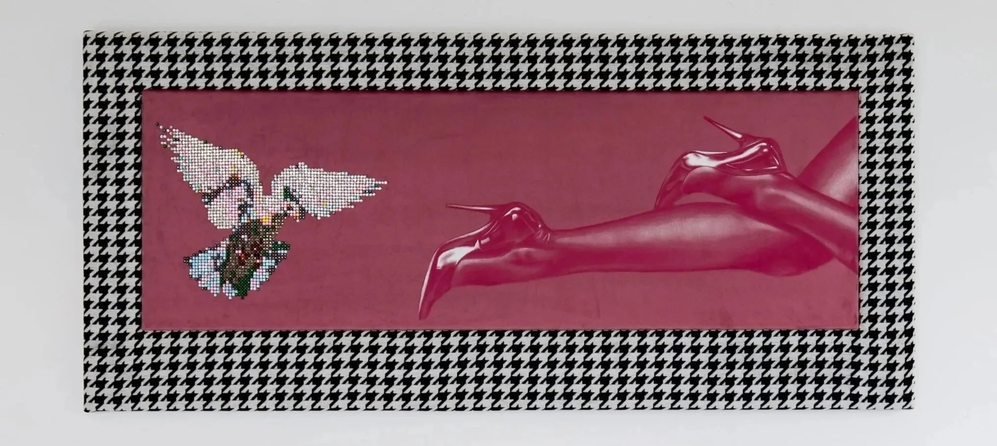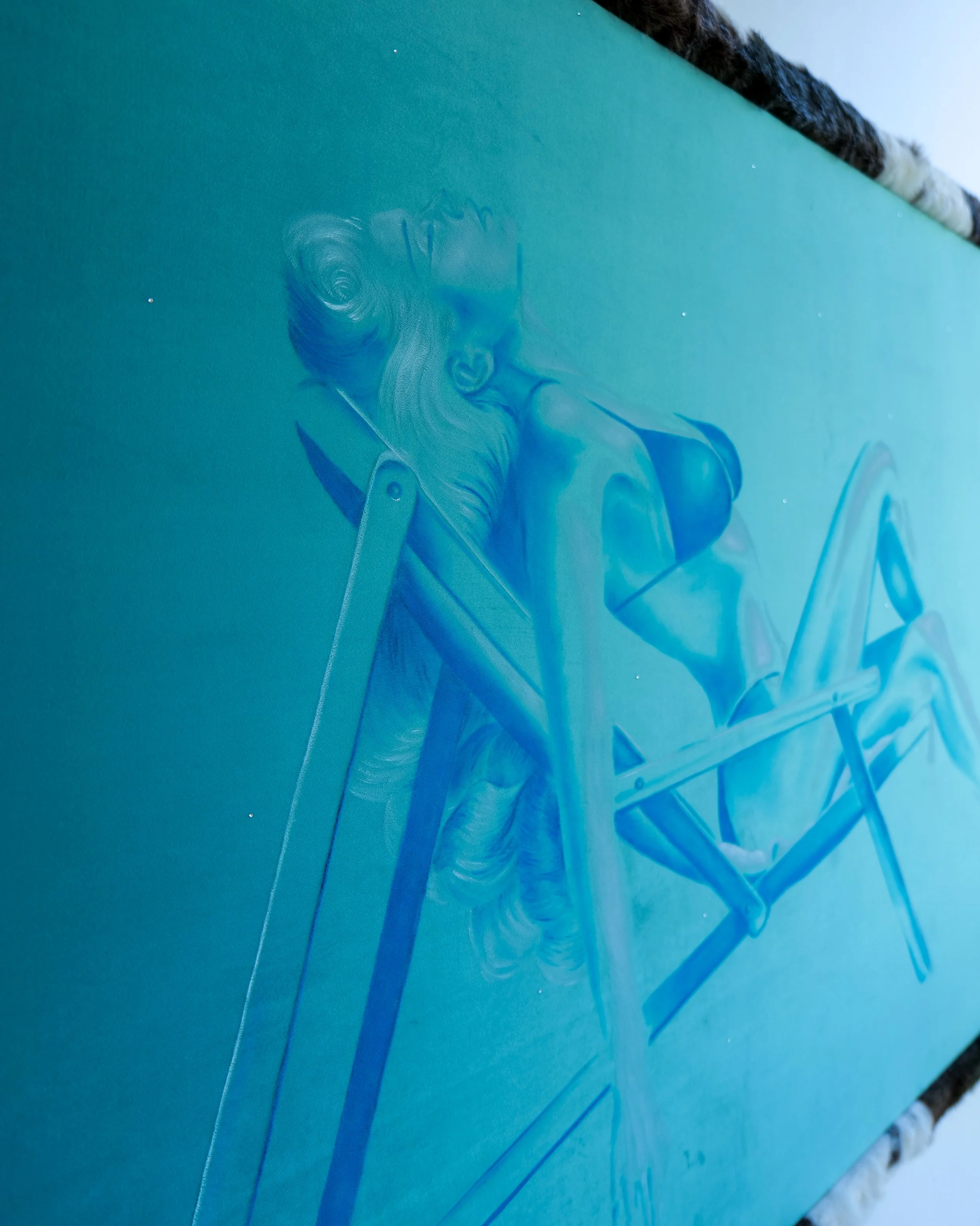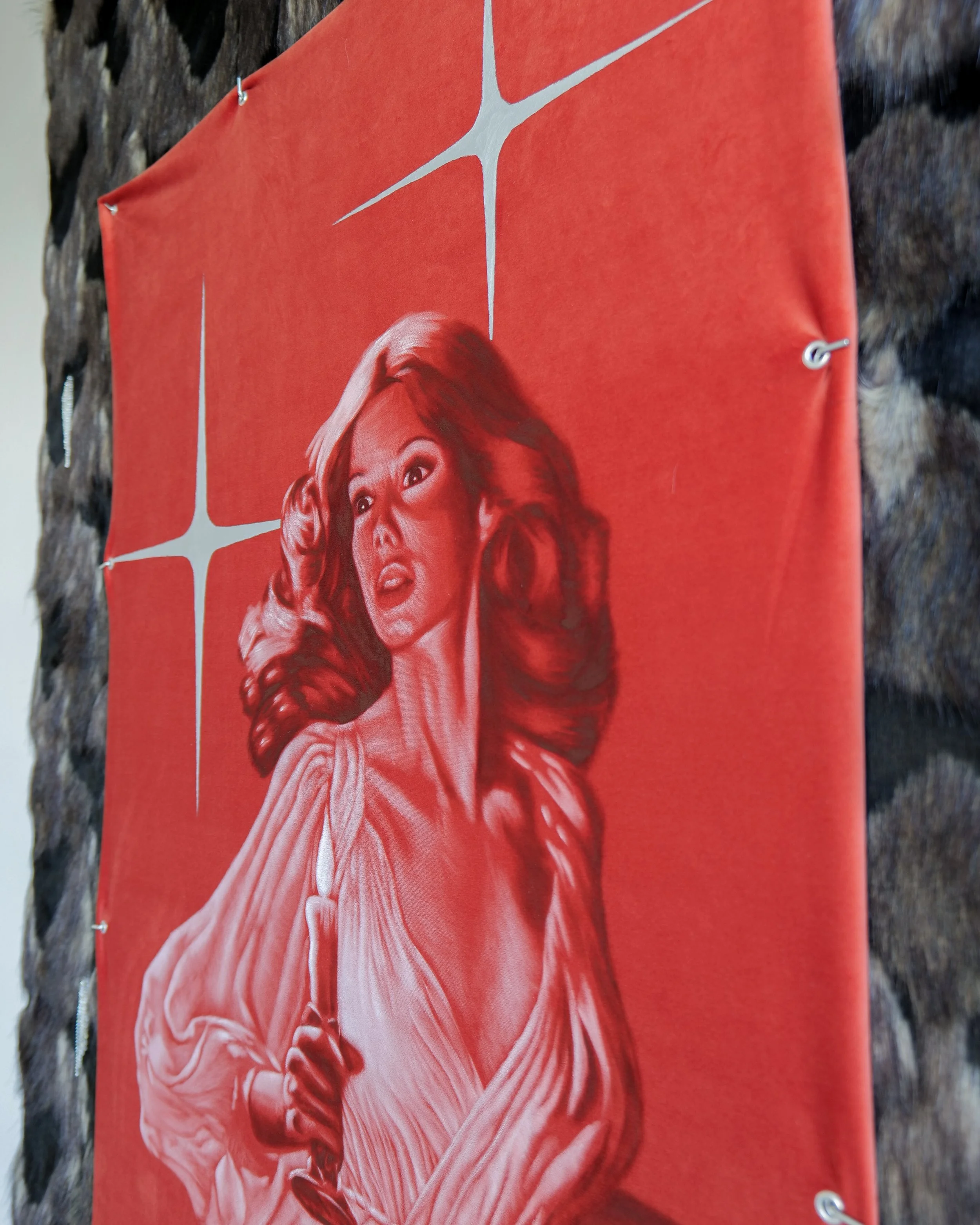 Painted on velvet and framed with faux fur, rhinestones, and patterned surfaces, the works lean into glamour and excess without trying to stabilise the image. The scenes feel familiar but don’t fully land. Things are pushed a bit too far, or not explained enough.
