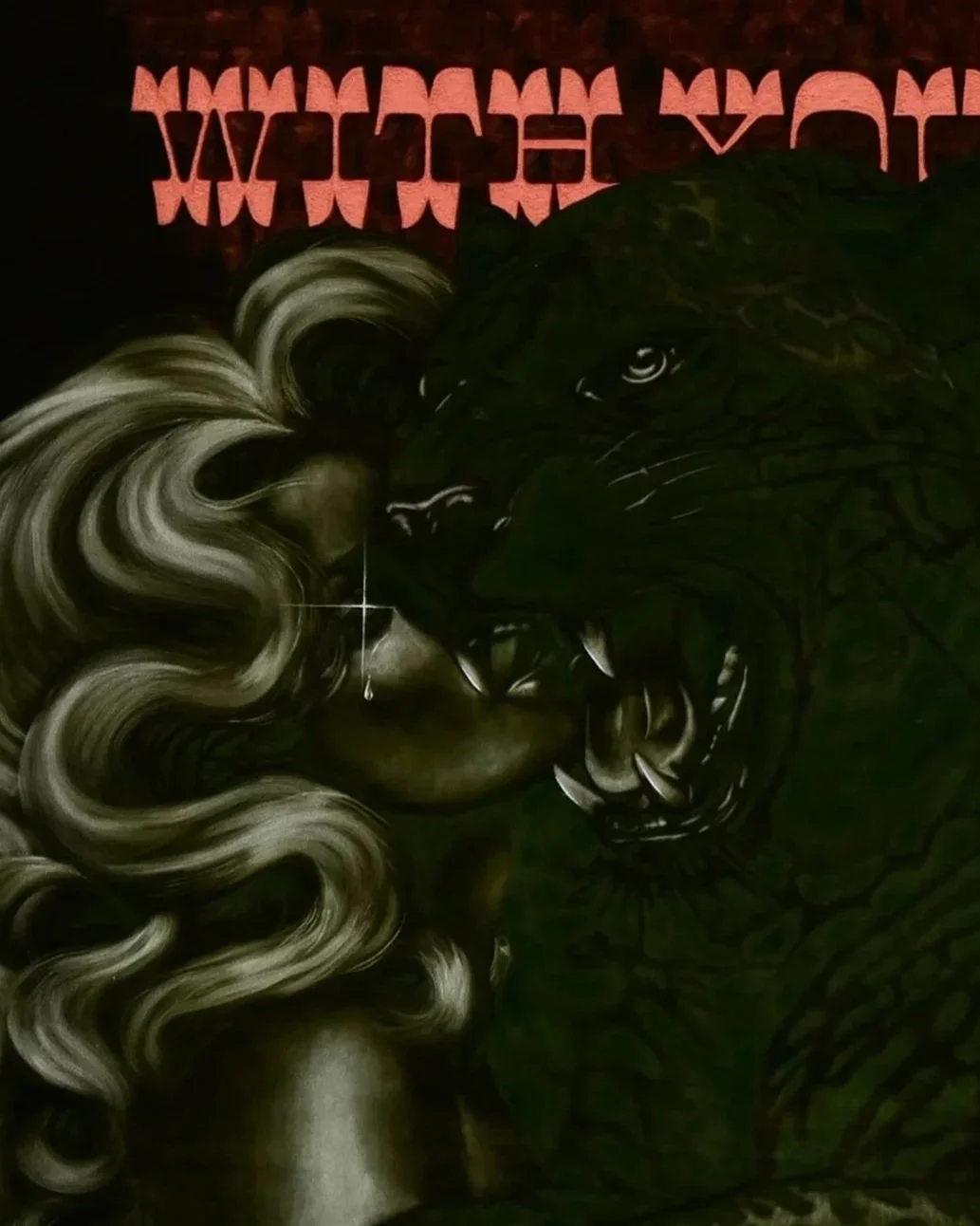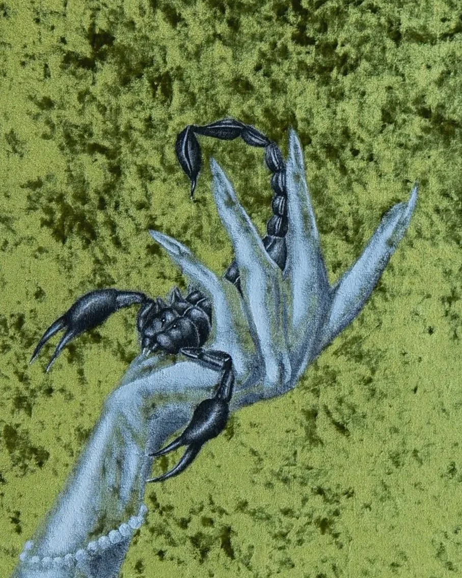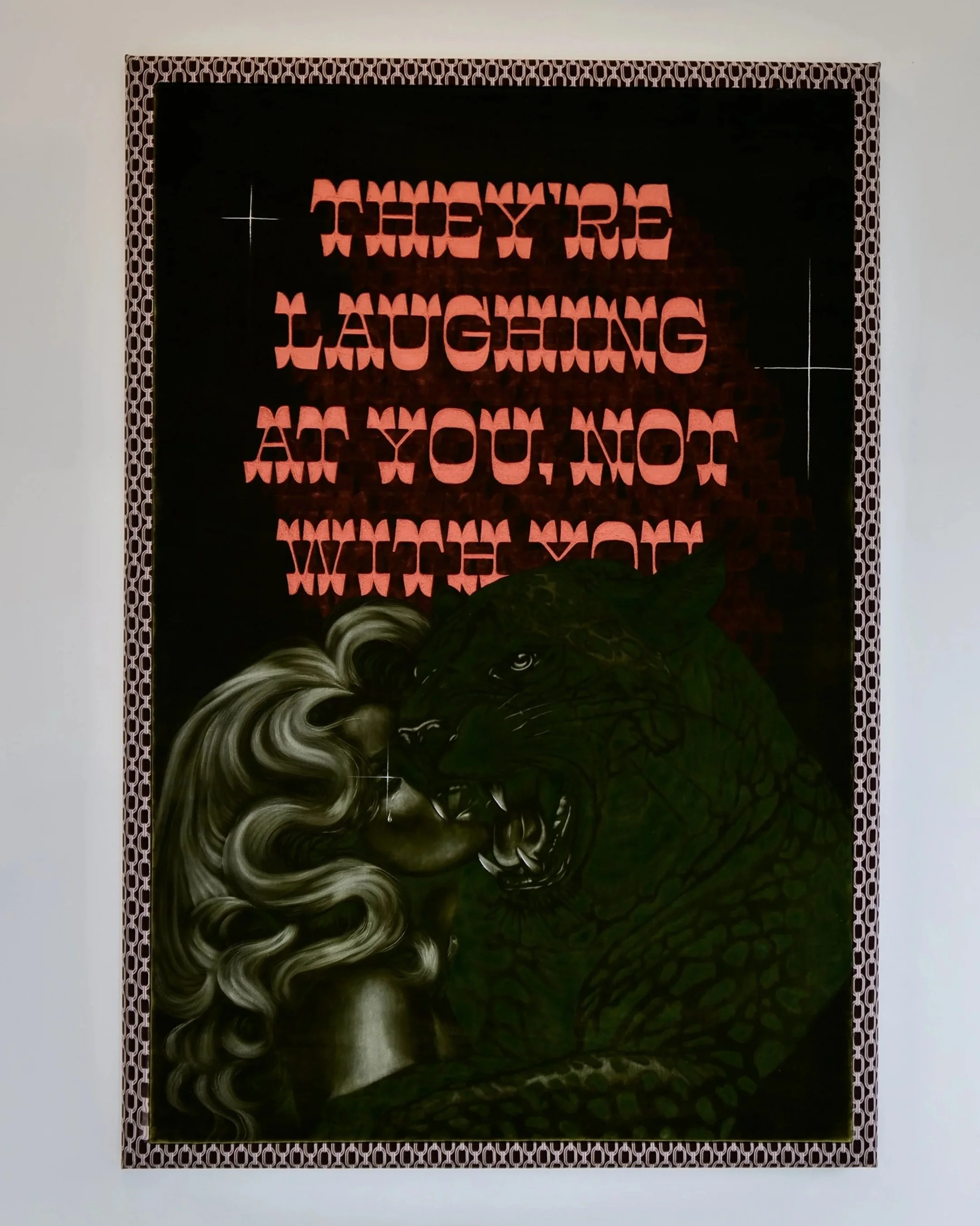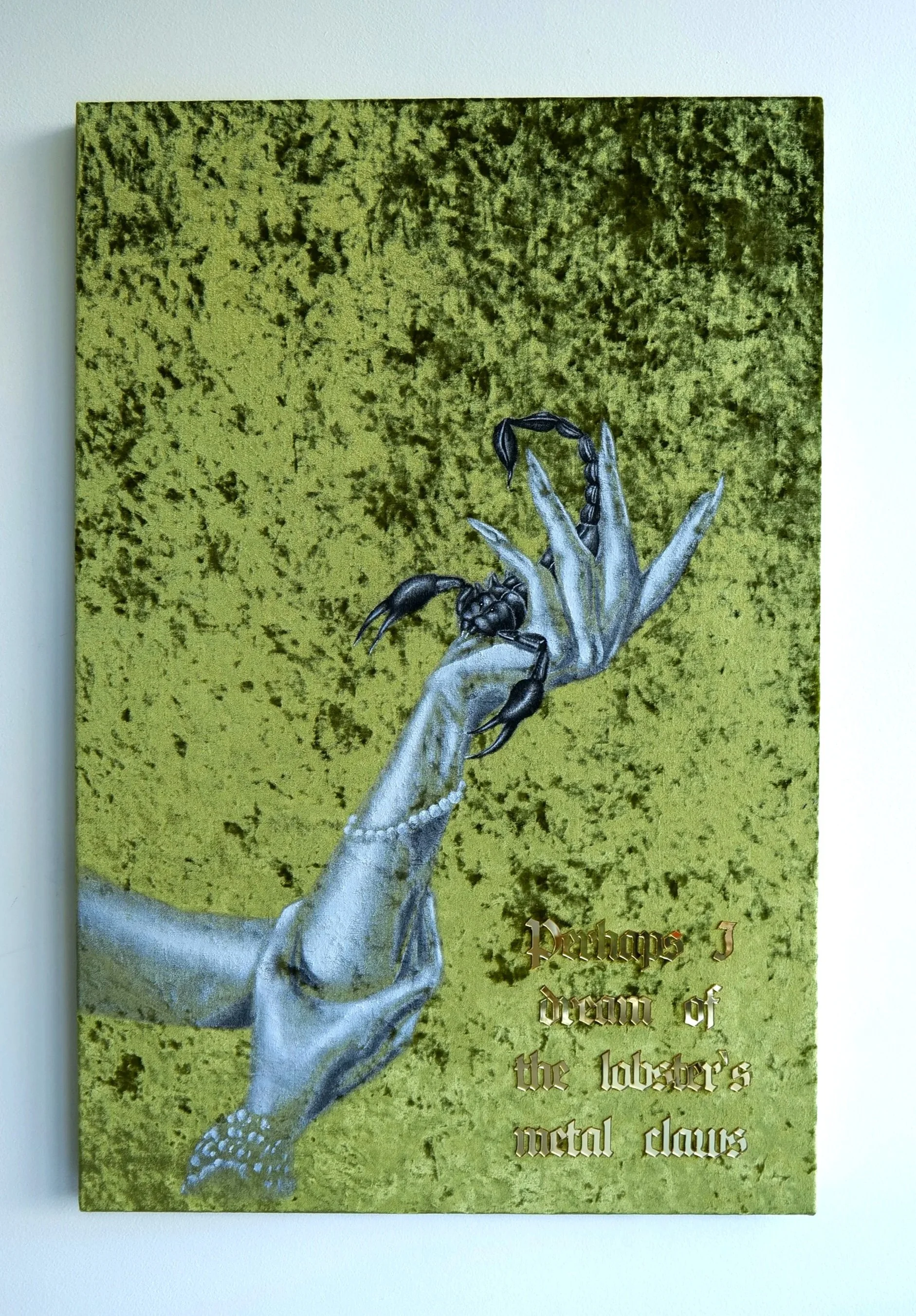 Painted on velvet and framed with faux fur, rhinestones, and patterned surfaces, the works lean into glamour and excess without trying to stabilise the image. The scenes feel familiar but don’t fully land. Things are pushed a bit too far, or not explained enough.